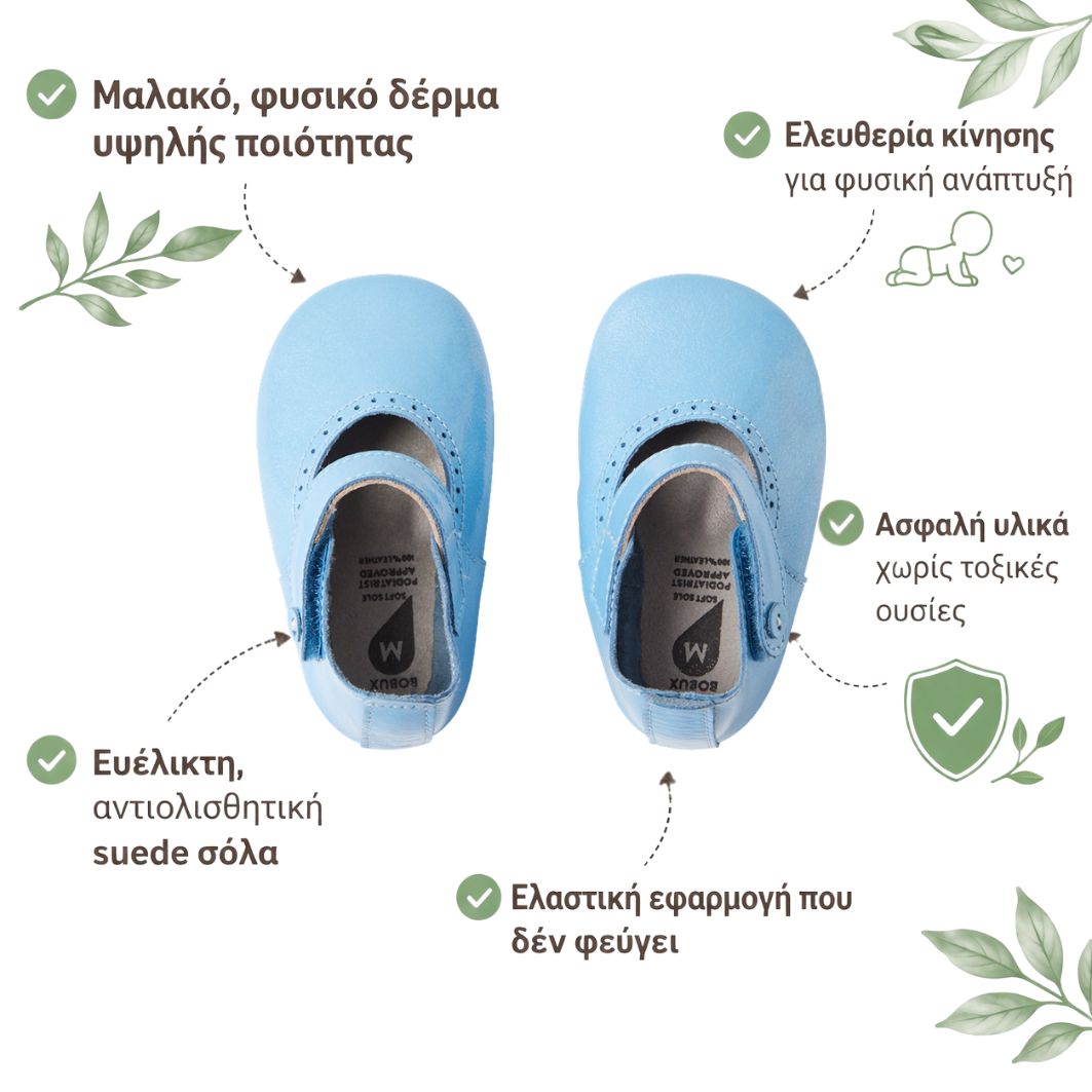 Τα Bobux Soft Sole είναι σχεδιασμένα για τα πρώτα στάδια ζωής του μωρού, προσφέροντας ελευθερία κίνησης και φυσική ανάπτυξη. Το μαλακό δέρμα και η ευέλικτη κατασκευή επιτρέπουν στο ποδαράκι να κινείται φυσικά, χωρίς περιορισμούς.