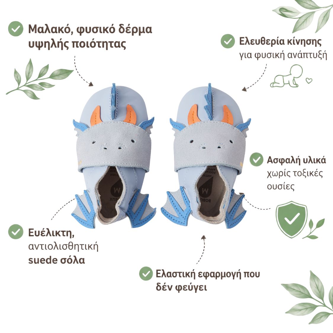 Τα Bobux Soft Sole είναι σχεδιασμένα για τα πρώτα στάδια ζωής του μωρού, προσφέροντας ελευθερία κίνησης και φυσική ανάπτυξη. Το μαλακό δέρμα και η ευέλικτη κατασκευή επιτρέπουν στο ποδαράκι να κινείται φυσικά, χωρίς περιορισμούς.